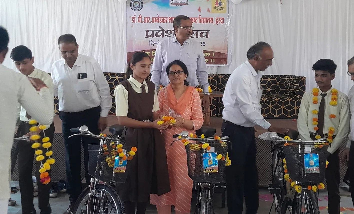 अनोखा तीर, हरदा। स्कूल चलें अभियानÓ के तहत बुधवार को स्थानीय डॉ. बी.आर. अम्बेडकर शासकीय उत्कृष्ट विद्यालय में जिला स्तरीय प्रवेशोत्सव कार्यक्रम हर्षोल्लास के साथ आयोजित किया गया। कार्यक्रम में जिला पंचायत उपाध्यक्ष दर्शनसिंह गेहलोत मुख्य अतिथि के रूप में तथा राज्य शिक्षा केन्द्र भोपाल की ओआईएस श्रीमती वीणा वारसने विशिष्ट शिक्षक के रूप में शामिल हुए। कार्यक्रम का शुभारंभ दीप प्रज्जवलन एवं सरस्वती वंदना के साथ हुआ। इसके बाद जिला शिक्षा अधिकारी डीएस रघुवंशी ने जिले का वार्षिक शिक्षा प्रतिवेदन प्रस्तुत किया। इस अवसर पर अतिथियों द्वारा नवागत विद्यार्थियों का तिलक लगाकर, माल्यार्पण कर व मिठाई खिलाकर स्वागत किया गया। कार्यक्रम में अतिथियों ने छात्र-छात्राओं को नि:शुल्क पाठ्यपुस्तकें और साइकिलें वितरित कीं। जिला पंचायत उपाध्यक्ष श्री गेहलोत ने इस अवसर पर अपने संबोधन में विद्यार्थियों को नियमित स्कूल आने और कड़ी मेहनत कर जिले का नाम रोशन करने के लिए प्रोत्साहित किया। उन्होने कहा कि शिक्षा ही जीवन में सफलता का मूल आधार है, विद्यार्थी पूरे मनोयोग से पढ़ाई करें और अपने लक्ष्य को प्राप्त करें। कार्यक्रम में भोपाल में आयोजित राज्य स्तरीय प्रवेशोत्सव कार्यक्रम का सीधा प्रसारण भी दिखाया गया। विद्यार्थियों और शिक्षकों ने मुख्यमंत्री के संबोधन को सुना और शिक्षा के प्रति शासन की योजनाओं की जानकारी ली। कार्यक्रम में जिला शिक्षा अधिकारी डी.एस. रघुवंशी, एडीपीसी ओएस महाजन सहित अन्य अधिकारी कर्मचारी, शिक्षकगण, पालकगण व छात्र-छात्राएं उपस्थित थे। कार्यक्रम का संचालन विद्यालय के शिक्षक नितिन सोनी ने किया एवं अंत में आभार प्रदर्शन विद्यालय के प्राचार्य संतोष यादव ने किया।