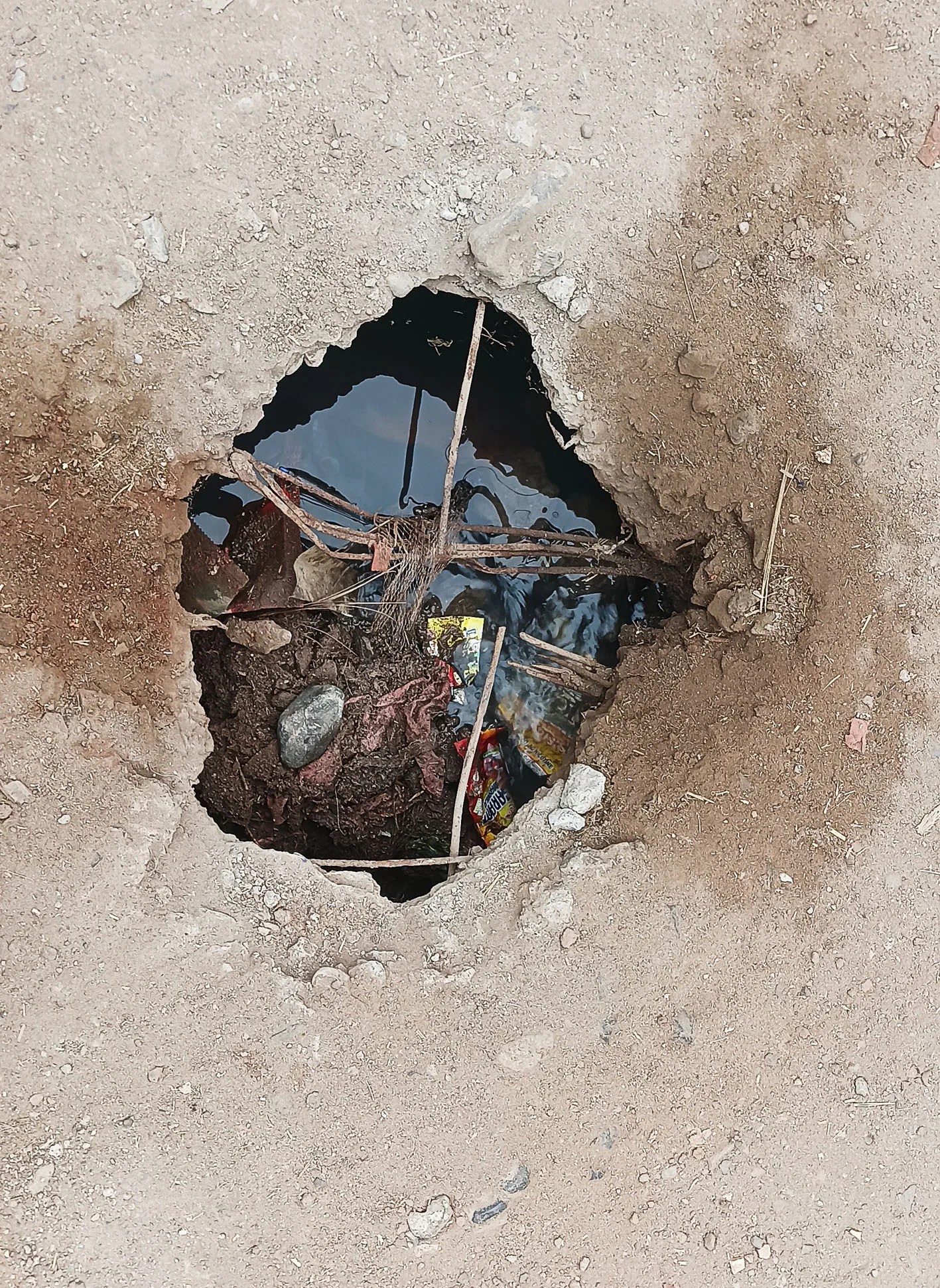 पाइप फूटने से बीच सड़क पर बना गड्ढा, हादसों का खतरा
